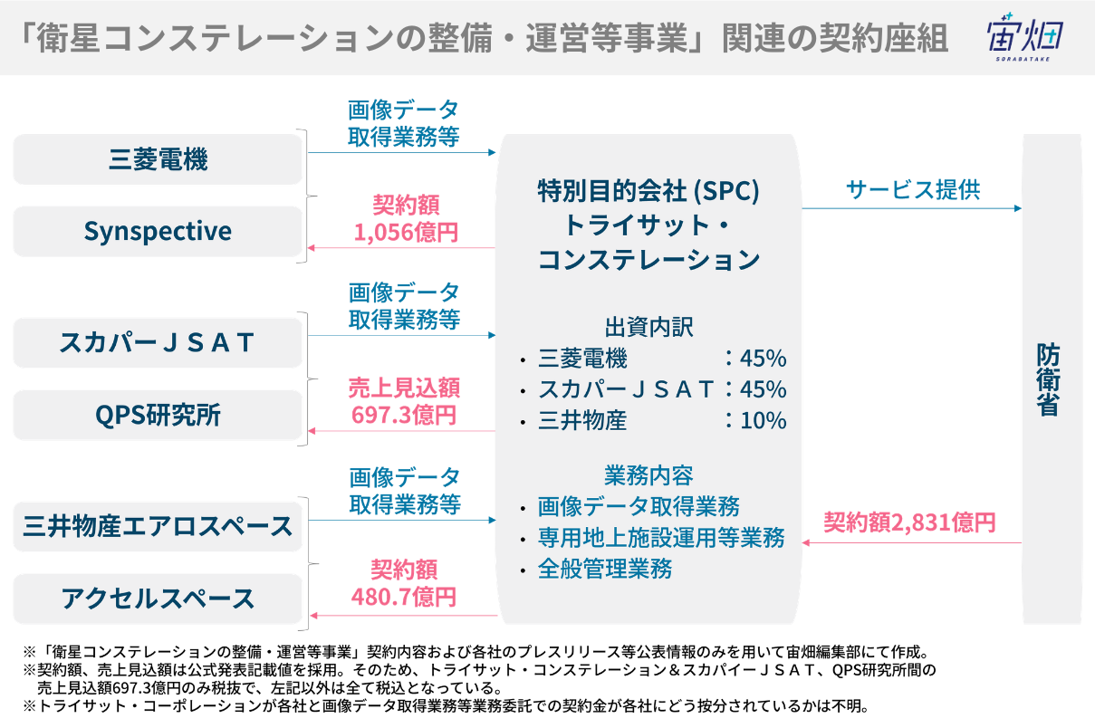 冒頭で紹介した通り、三菱電機、スカパーJSAT、三井物産の3社がSPC「トライサット・コンステレーション」を設立。このSPCが防衛省と契約を締結し、事業全体を管理します。