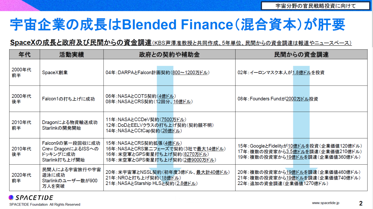 今回のワーキンググループのひとつの大きなテーマとして明確に意識されていたのは、SpaceXが世界最大の宇宙企業へ成長した背景には官民による「混合資本」があったと述べられたことでしょう。