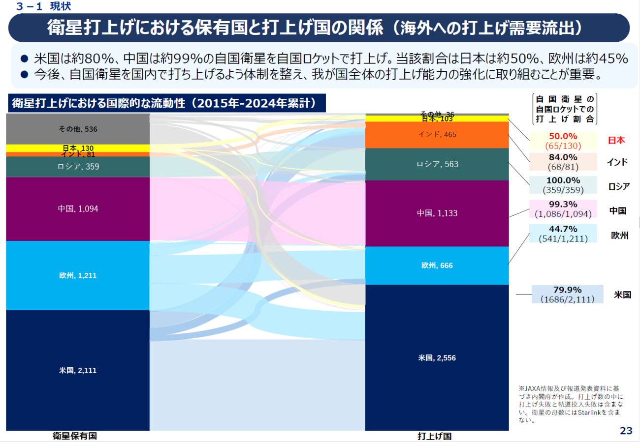日本は自国衛星の50%しか国内で打ち上げられていない現状の課題も示されました。