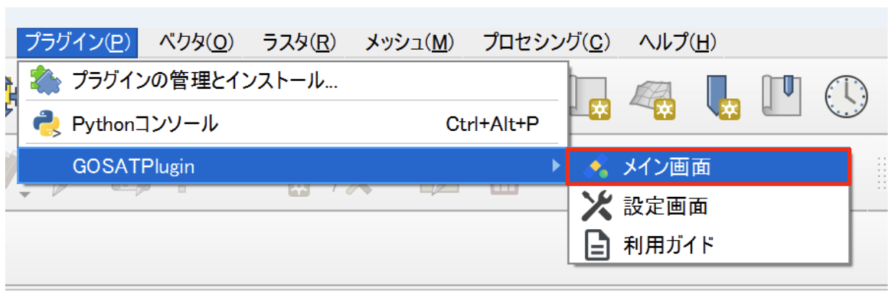 メニューバーより[プラグイン]→[GOSATPlugin]→[メイン画面]を選択し、プラグインを起動します。