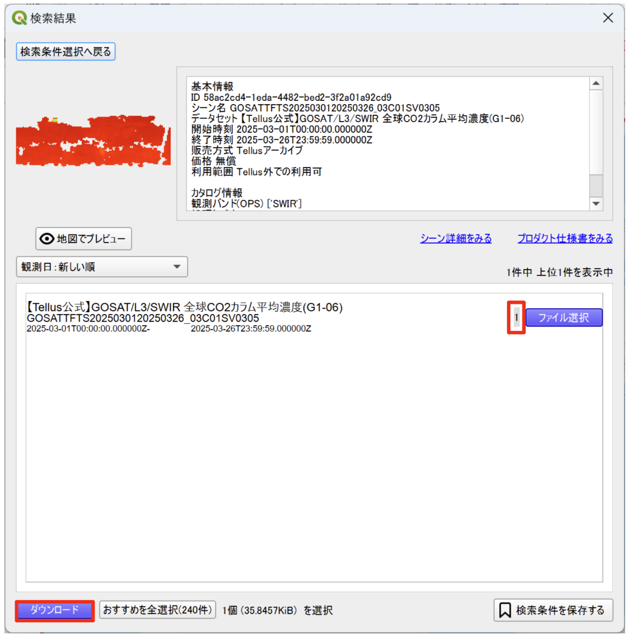 リストからシーンを選択すると、地図上にそのシーンのカバレッジ領域が赤枠でハイライト表示されます。今回使用しているデータは全球データのため、地球全域がハイライトされていますが、特定範囲を観測したデータの場合は、この機能を使ってダウンロード前に対象領域を確認できるため便利です。