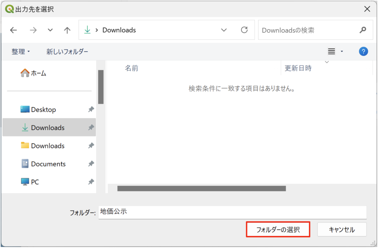 任意の保存先に移動して、[フォルダの選択]をクリック