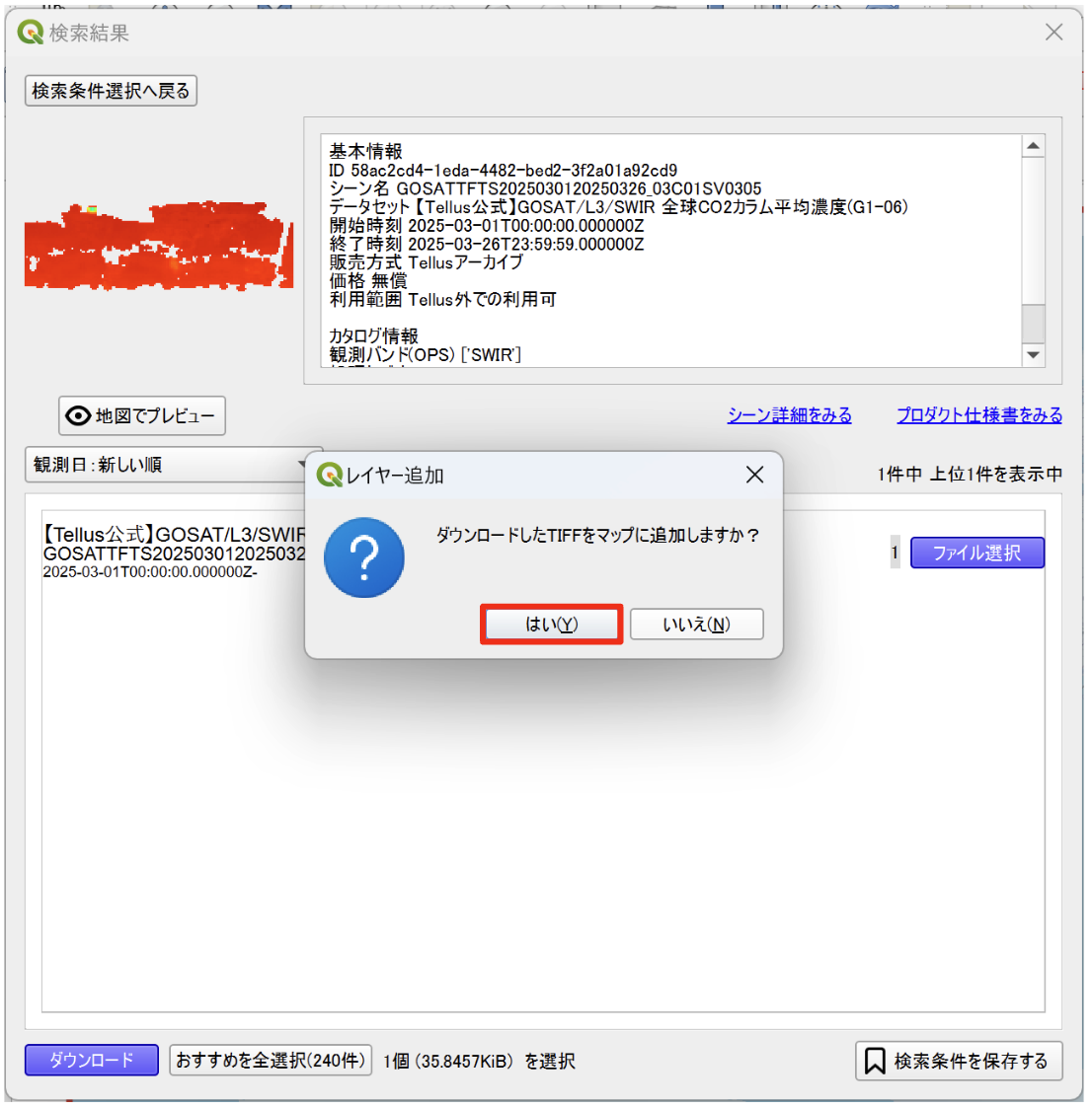 フォルダを選択して保存する場所を決めて、ダウンロードが開始されます。ダウンロード完了したら、「ダウンロードしたTIFFをマップに追加しますか?」と出るので[はい]を押すことで取得したデータがレイヤに追加されます。