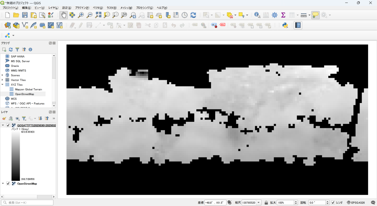 CO₂の全球濃度分布マップをQGISに追加できましたが、初期状態では白黒で描画されており、データが見づらくなっています。ここでは、データを見やすくするためにカラーマップ化する方法を紹介します。