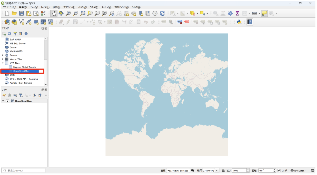 GOSATプラグインを使用する際に、背景地図があると便利です。ブラウザパネルのXYZタイルを開き、[OpenStreetMap]をダブルクリックしてマップキャンバスにドラッグ&ドロップしましょう。