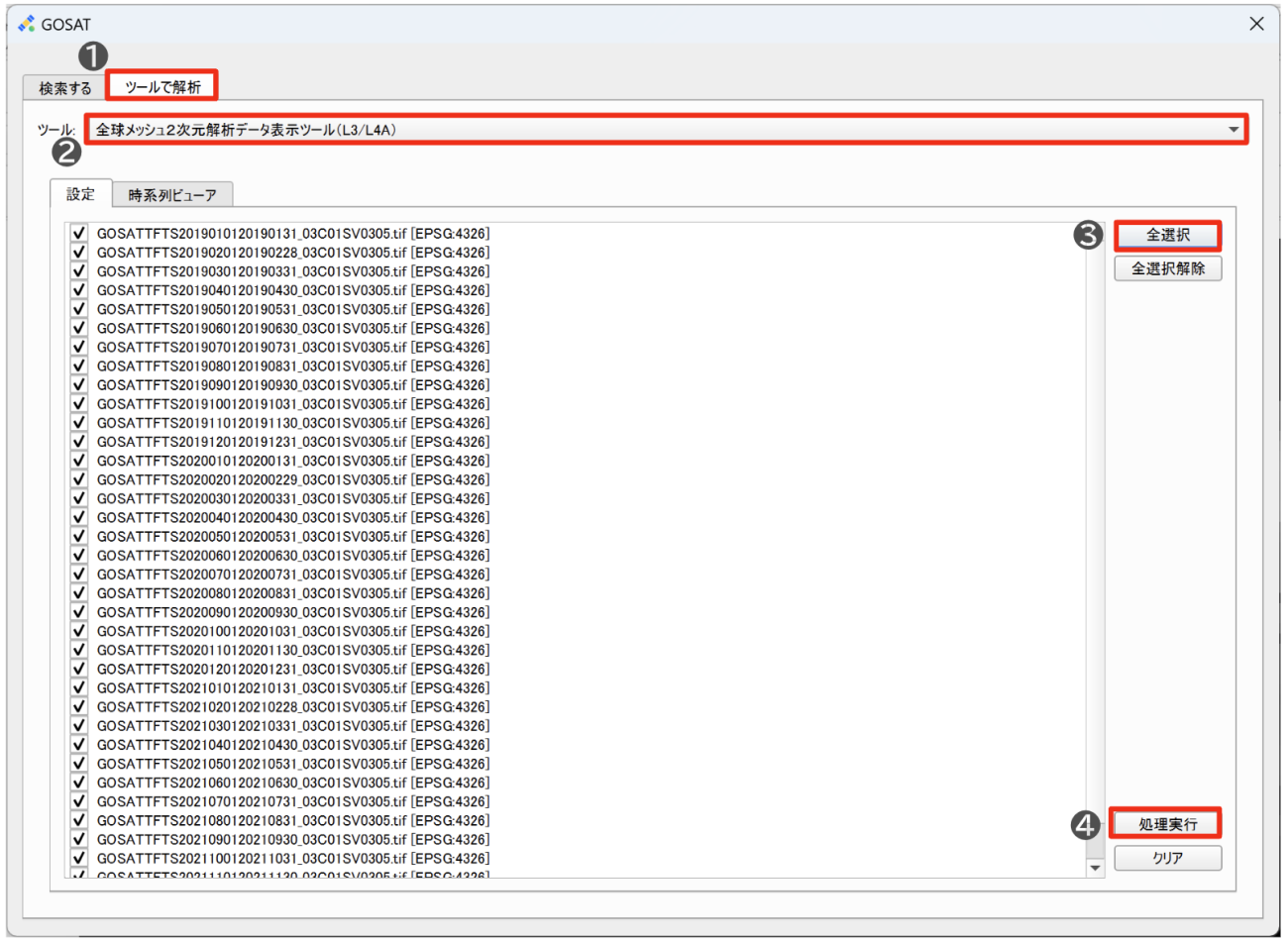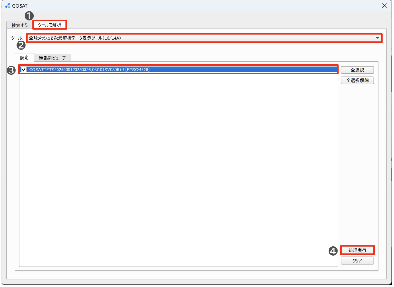 2.[全球メッシュ2次元解析データ表示ツール(L3/L4)]を選択します。選択すると、このツールで解析可能なデータが自動的に設定のリストに表示されます。