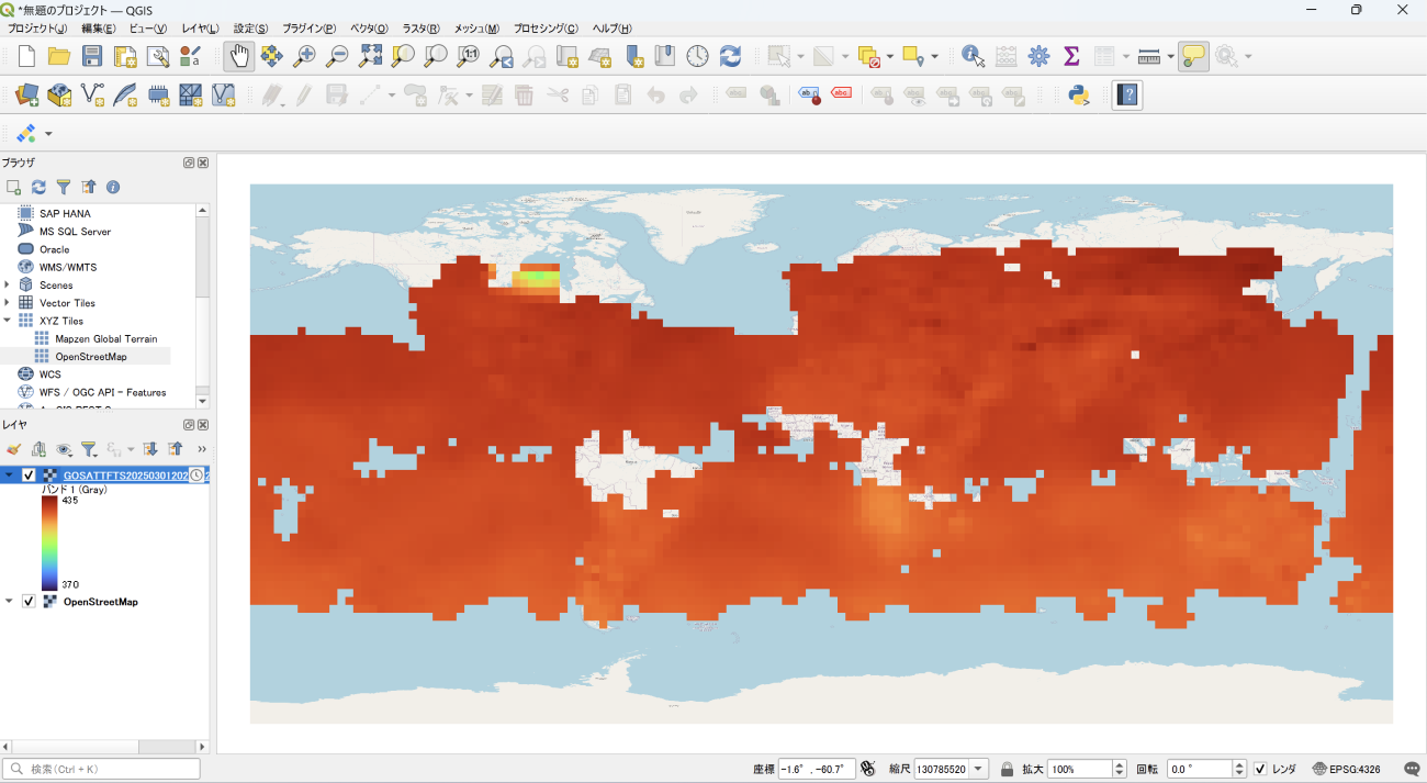 ここでは、GOSATプラグインを使用して「CO₂の全球濃度分布マップ」を作成する手順を説明します。今回は、例として2025年3月の全球CO₂濃度分布マップを作成してみます。