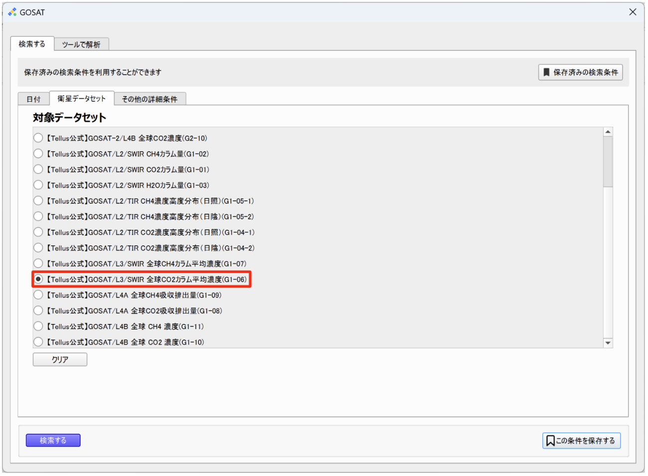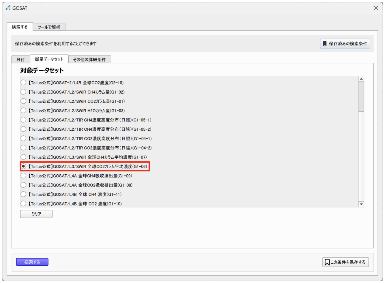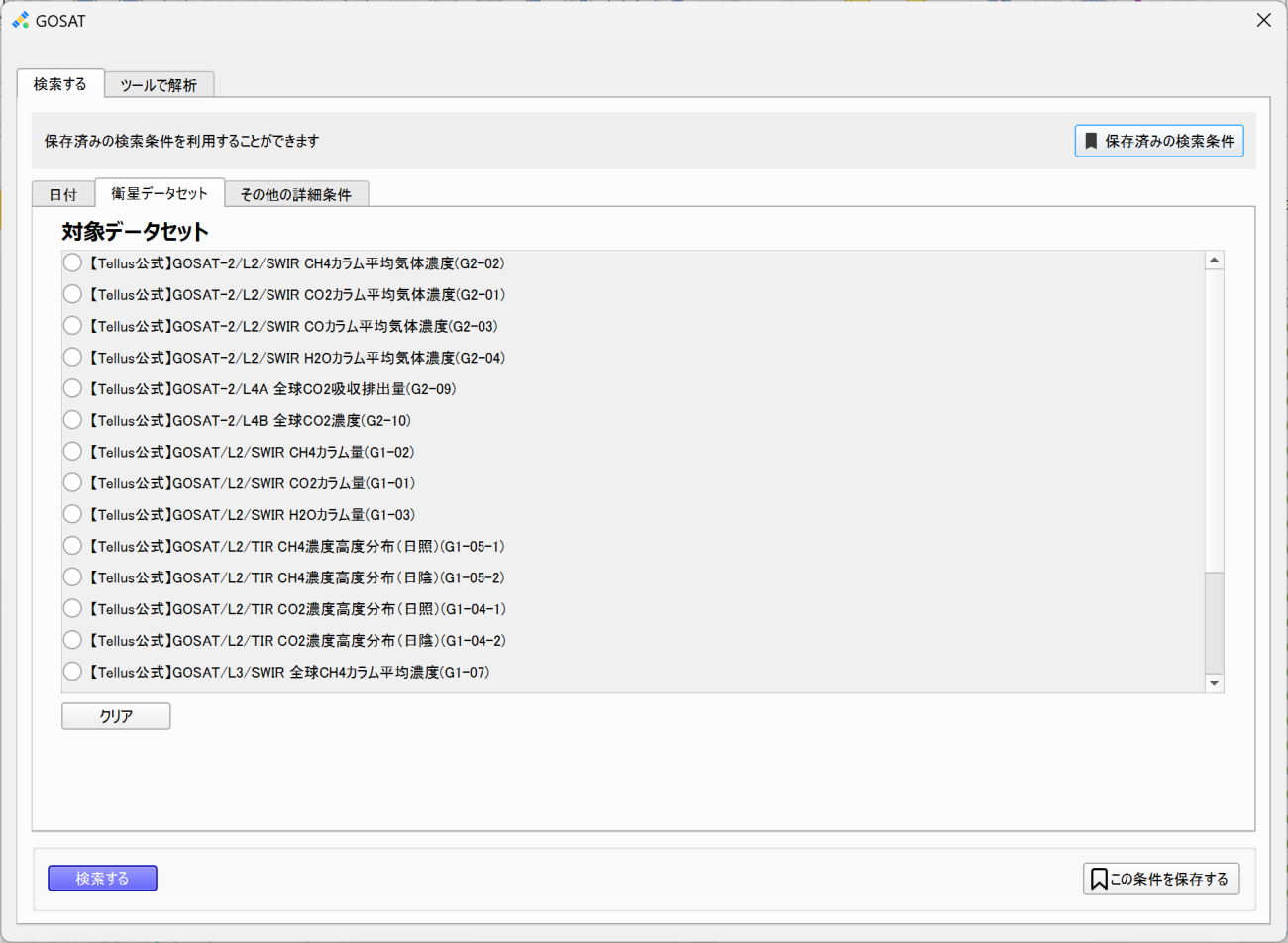 [メイン画面]の[検索する]タブ内で、検索の対象とするデータセットを選びます。[衛星データセット]タブを開くと、Tellusで提供されている「GOSAT/GOSAT-2」のデータ一覧が表示されていることが確認できます。