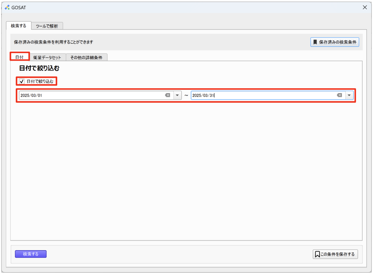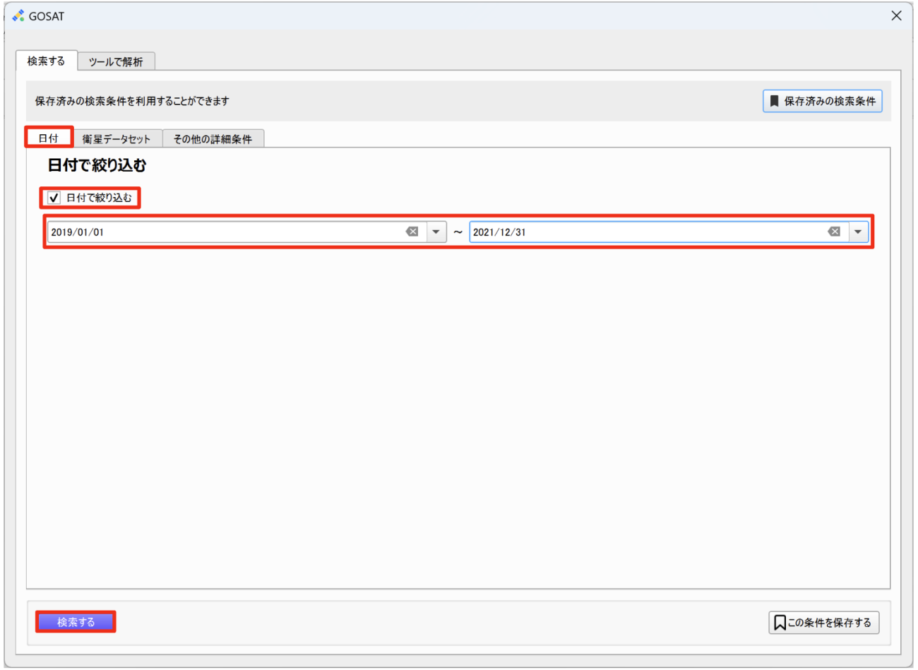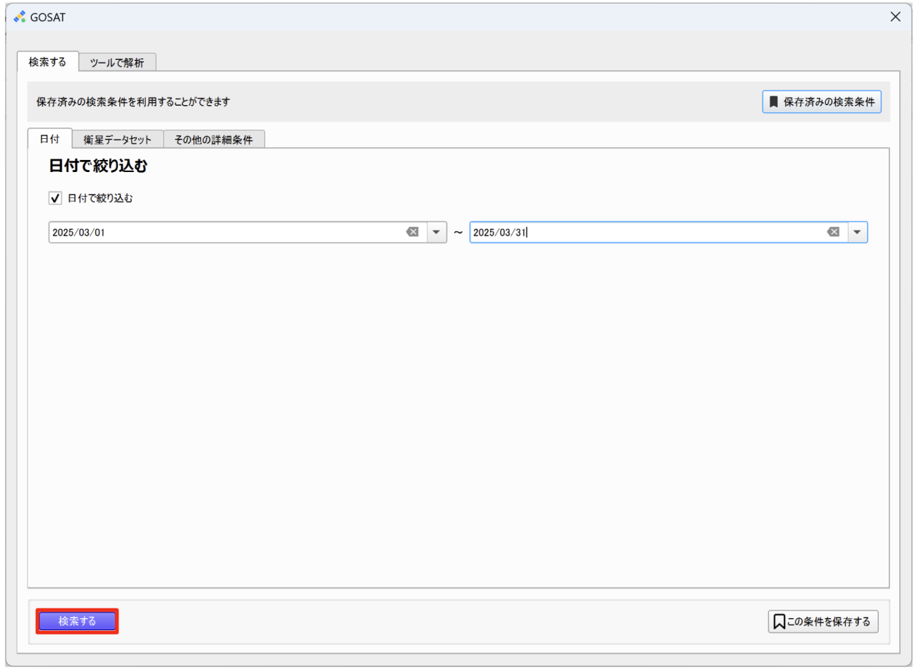 データセットと日付を設定したら、画面下部の[検索する]ボタンをクリックしましょう。