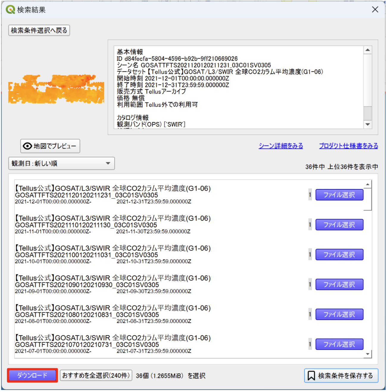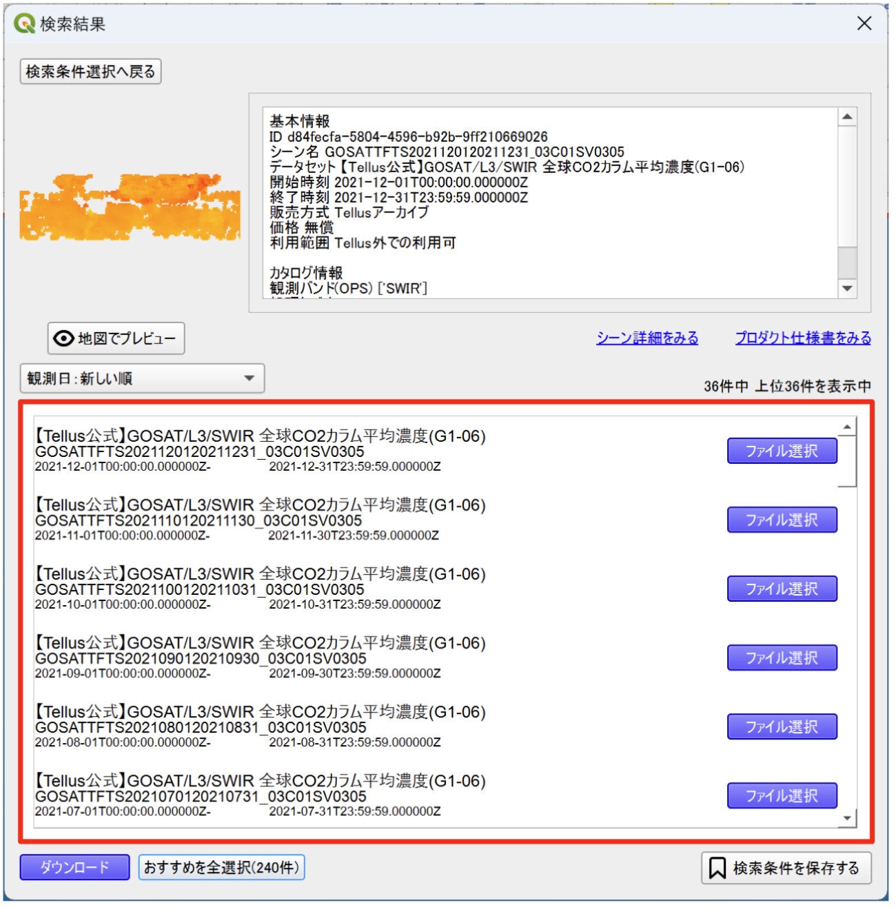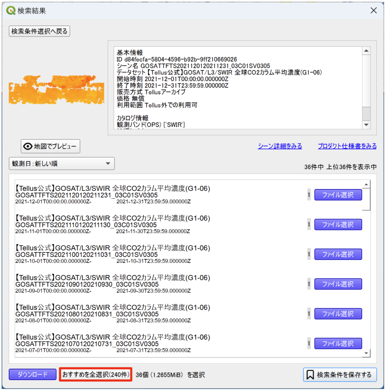 検索結果からすべてのデータをダウンロードするために、[おすすめを全選択(240件)]ボタンをクリックします。これにより、検索結果の解析対象ファイルを自動的に最大240件選択できます。今回の場合、このボタンをクリックすると、各シーンのおすすめの表示用tifファイルが計36個選択されたことがわかります。