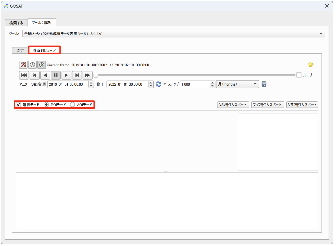 ウィンドウ上で[選択モード]にチェックをいれると、[POIモード(地点)]または[AOIモード(範囲)]を選べるようになります。ここでは特定都市のある地点を対象としたいため、[POIモード]を選択します。