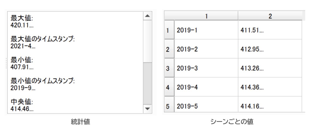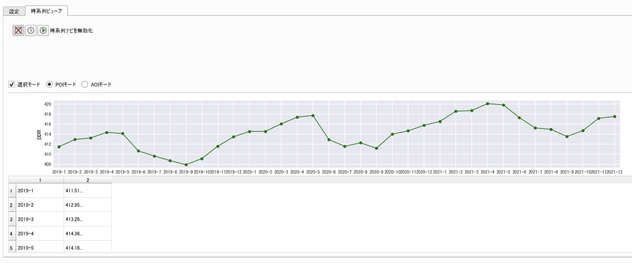 また、グラフとともに、選択したPOI/AOIの具体的な数値データ表もウィンドウ内に表示されており、各月の濃度値や統計量を確認できます。必要に応じて[CSVエクスポート]ボタンでデータをCSV形式で保存することも可能です。