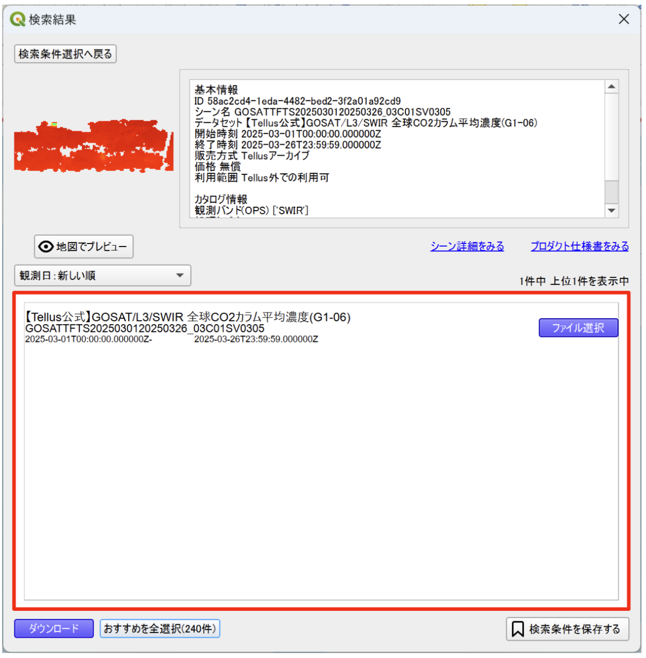 なお、今回のように2025年3月1日~31日で期間を絞り込むと、2025年3月に観測された1か月分のデータから算出された「全球のCO₂カラム平均濃度」データ(1シーン)が検索結果に表示されます。