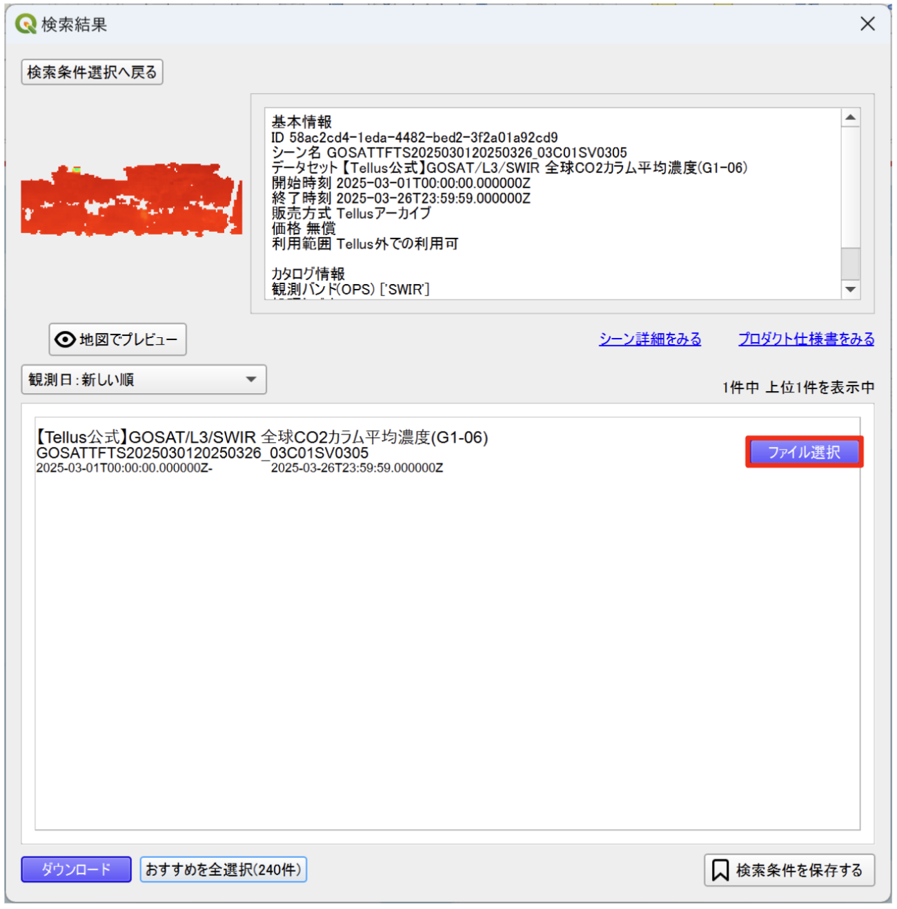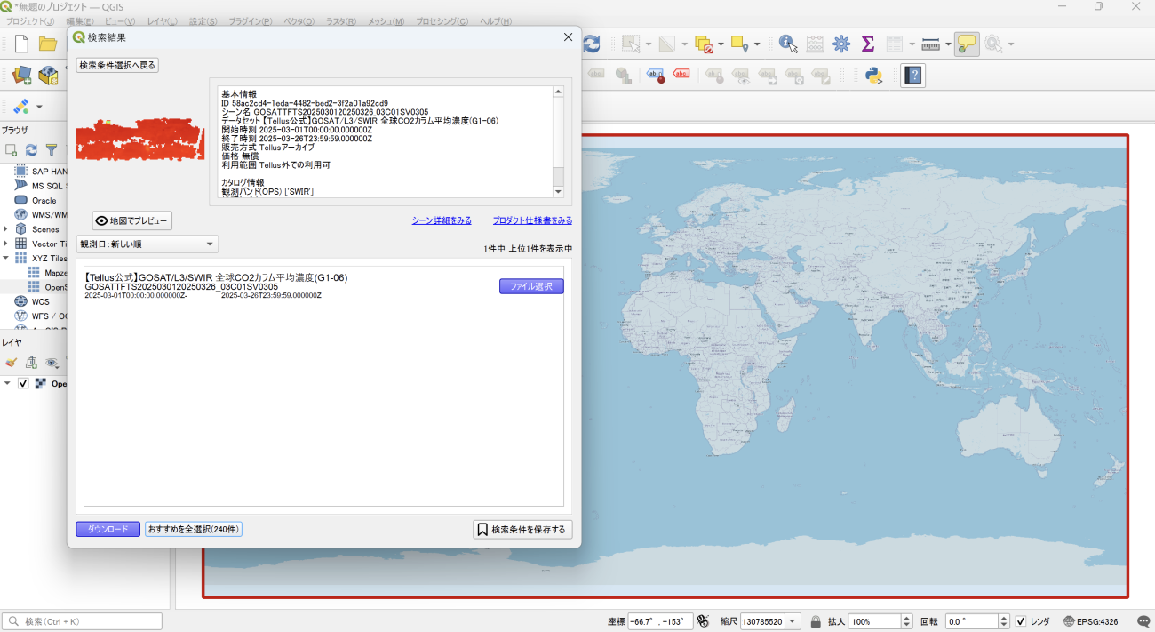 プラグインの[検索する]タブで先ほどと同じデータセット「【Tellus公式】GOSAT/L3/SWIR 全球CO2カラム平均濃度(G1-06)」を選択します。
