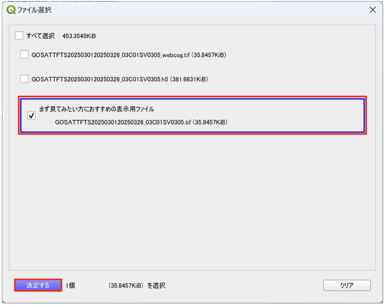 各シーンには、tifファイルやh5ファイルなど複数の形式のデータが用意されています。今回は「まず見てみたい方におすすめの表示用ファイル」と表示されているファイルにチェックを入れて[決定する]をクリックします。