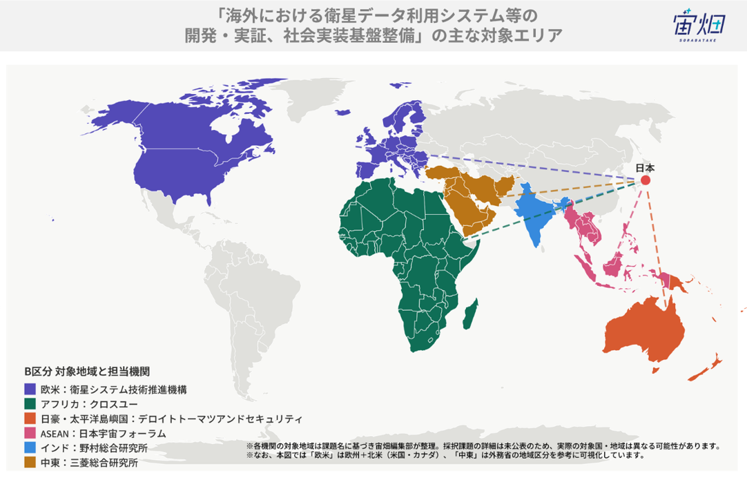 B区分は海外市場への橋渡し役です。衛星システム技術推進機構は欧米、野村総研はインド、三菱総研は中東(UAE等)、日本宇宙フォーラムはASEAN、デロイトトーマツスペースアンドセキュリティは豪州・太平洋島嶼国、クロスユーはアフリカをそれぞれ対象地域としており、A区分で生まれたソリューションを海外へ展開するための基盤整備を担う構図がうかがえます。