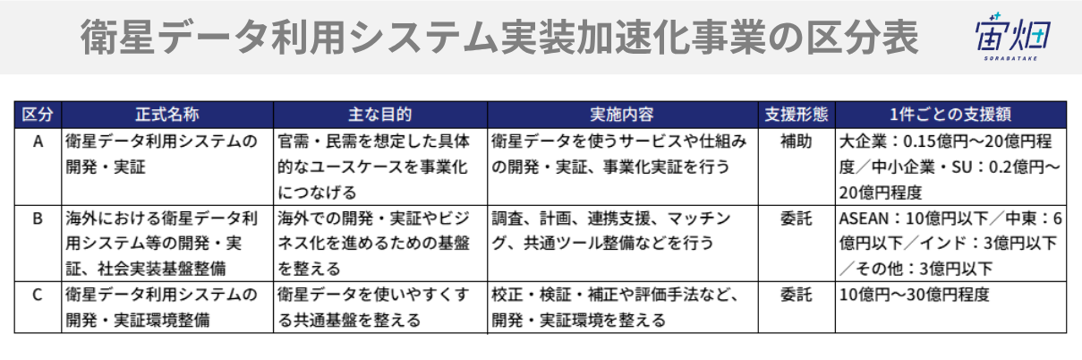 今回の採択は、A・B・Cの3区分がそれぞれ異なる役割を担っており、全体像を見ると「衛星データを社会に届けるための分業体制」が見えてきます。