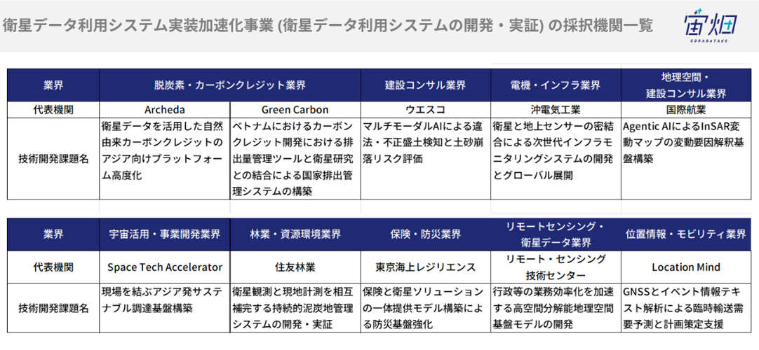 一方、脱炭素・カーボンクレジット業界のArchedaや、位置情報・モビリティ業界のLocation Mindは、衛星データを活用するスタートアップです。Space Tech Acceleratorは宇宙技術の社会実装を手がけるスタートアップや、リモートセンシング技術の普及・実装を支援する財団法人RESTECといった、衛星データを以前から活用するプレイヤーも採択されています。