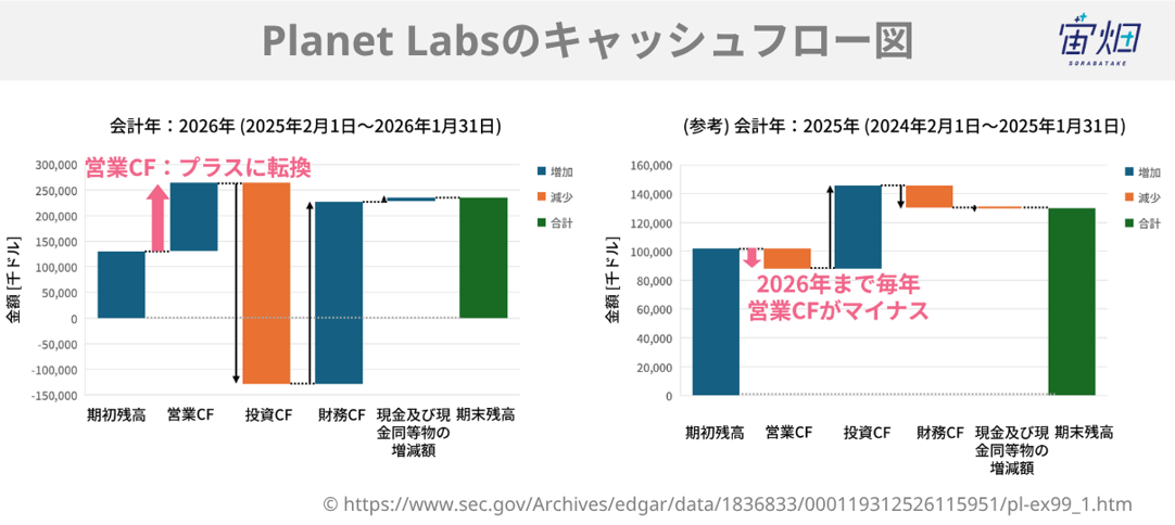 キャッシュフローの組み合わせで企業の状態を分類する「8分類」の考え方があります。Planet LabsはFY2025時点では「危機対応型」(営業CF−、投資CF+、財務CF−)に該当していました。本業の黒字化に向けて投資を調整しながら財務基盤を整えている段階です。