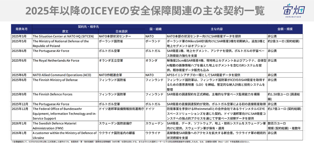 また、ICEYEもバックログの大半が国家安全保障関連と明言しています。2025年以降だけでもポーランド(約2億ユーロ)、フィンランド(約1.58億ユーロ)、ドイツ(Rheinmetallとの合弁で約17億ユーロ)など、欧州各国の防衛機関と大型契約を相次いで締結しています。