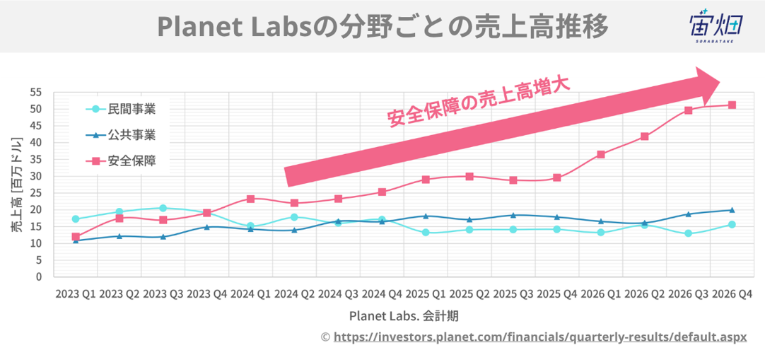 上部が示すように、Planet Labsの売上成長を牽引しているのは安全保障分野です。民間事業や公共事業が横ばいで推移する中、安全保障分野の売上は急激に伸びています。