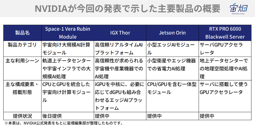 NVIDIAが発表した製品群は、宇宙ビジネスの展開にあたって求められる軌道上から地上までの「計算レイヤー」を網羅的にカバーしています。