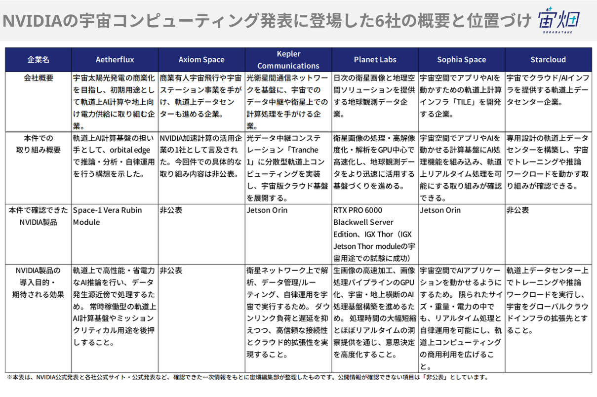 6社はそれぞれ異なる領域で宇宙コンピューティングに取り組んでいます。