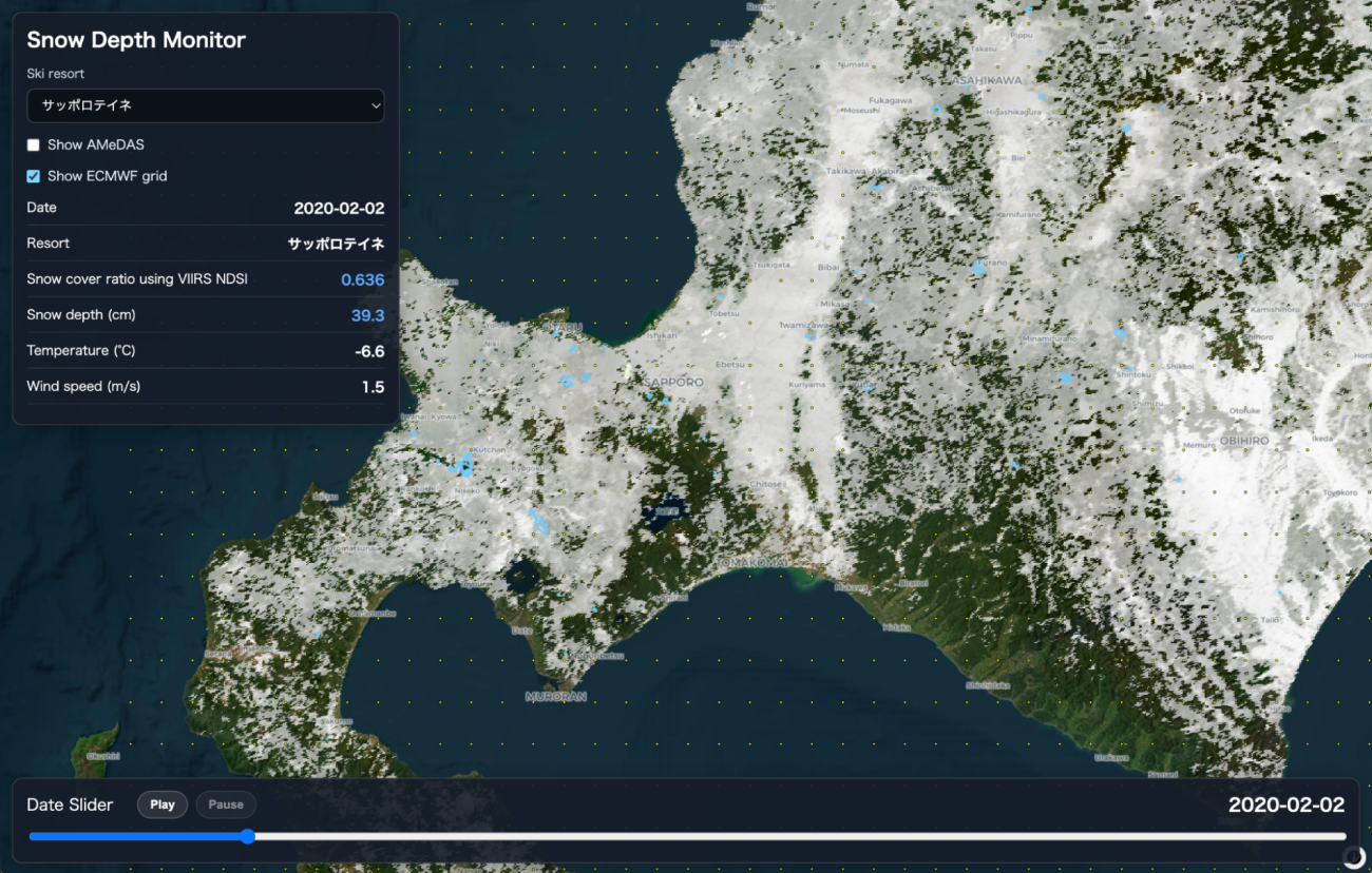 北海道内のスキー場を対象に、日次の気象データと衛星データを表示しています。