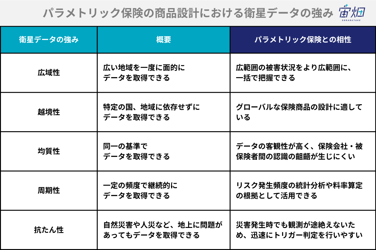 そのようなパラメトリック保険の運用における課題に対して、活用が期待されるのが、広域かつ均一に観測できるという大きな利点を持つ衛星データです。特定の地域に依存せず、同一の基準でデータを取得できるため、客観性が高い点が評価されています。また、継続的にデータが取得されるため、リスクの発生頻度や規模を統計的に分析するための長期的なデータを取得できるという面から、料率算定にも適しています。