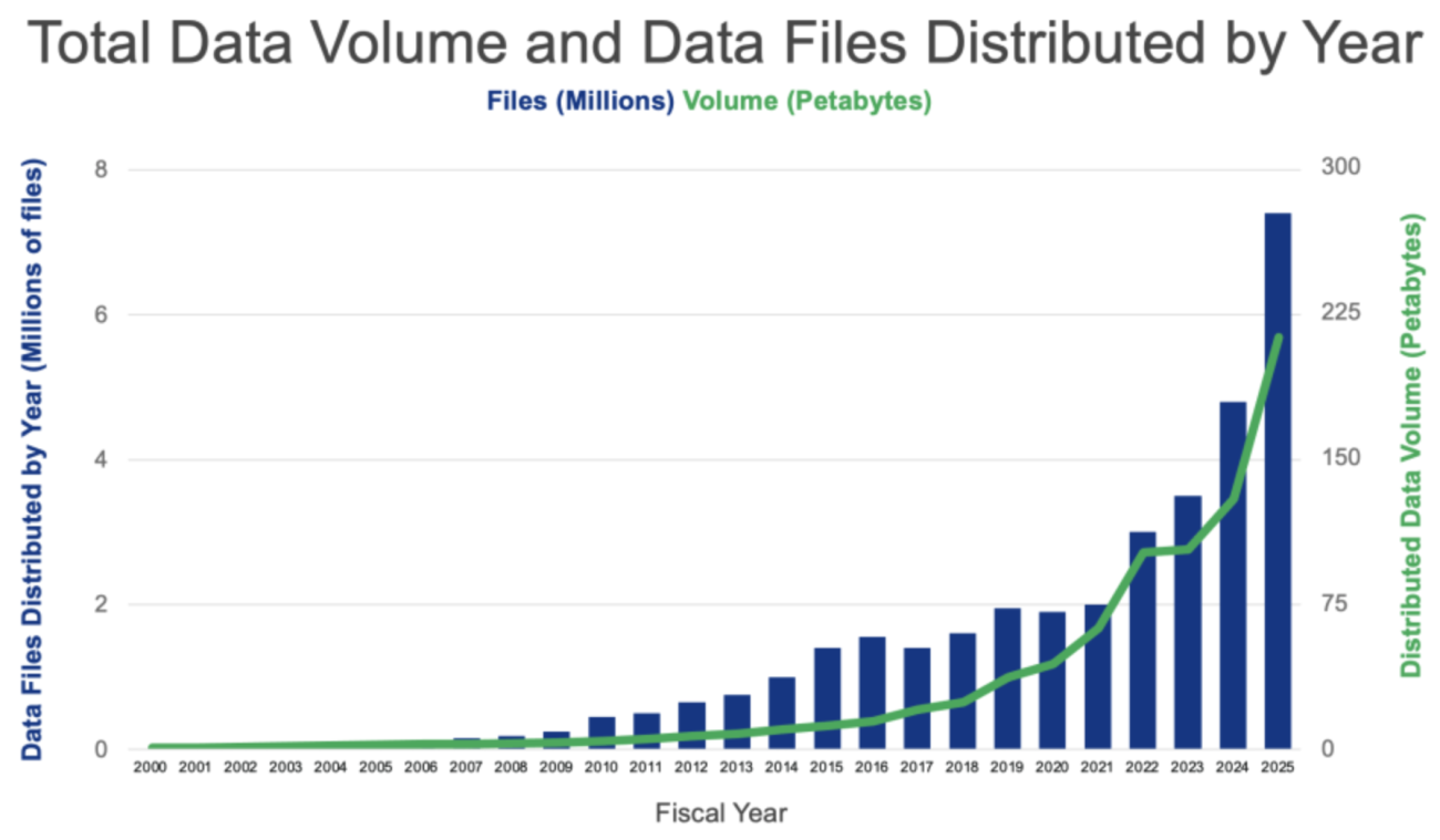 近年では、衛星コンステレーションの拡充や解析技術の進展により、データの解像度や更新頻度が大幅に向上しています。下図はNASAがまとめた衛星データの年度別のファイル数とファイルサイズになります。