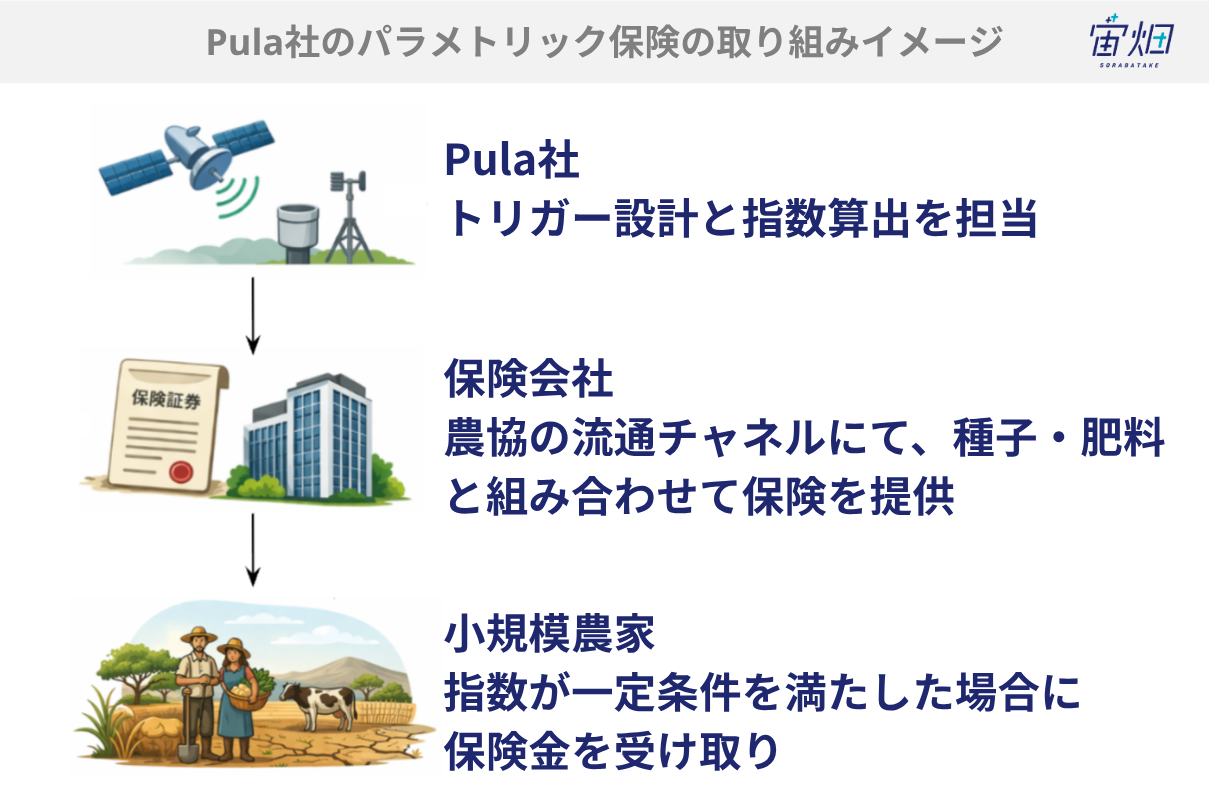 パラメトリック保険はすでに海外で広く実用化されています。その代表的な事例の一つが、アフリカを中心に展開するPula Advisors(以下、Pula社)です。Pula社は保険会社そのものではなく、各国の保険会社や再保険会社と連携し、パラメトリック保険の商品設計や指数算出を担う企業です。