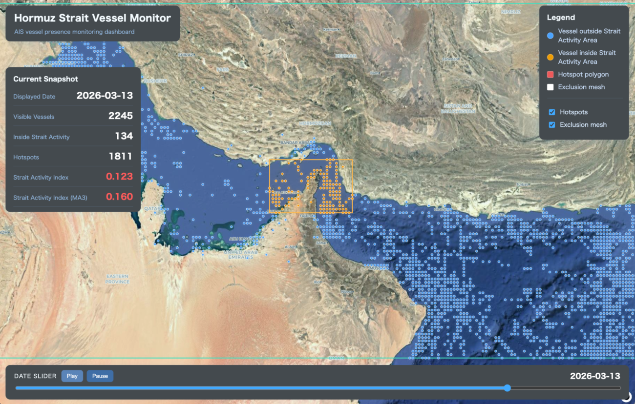 このAISデータを基に、ホルムズ海峡が大きな影響を受けた直後の2026年3月13日における船舶の位置情報を表示した結果を以下に示します。