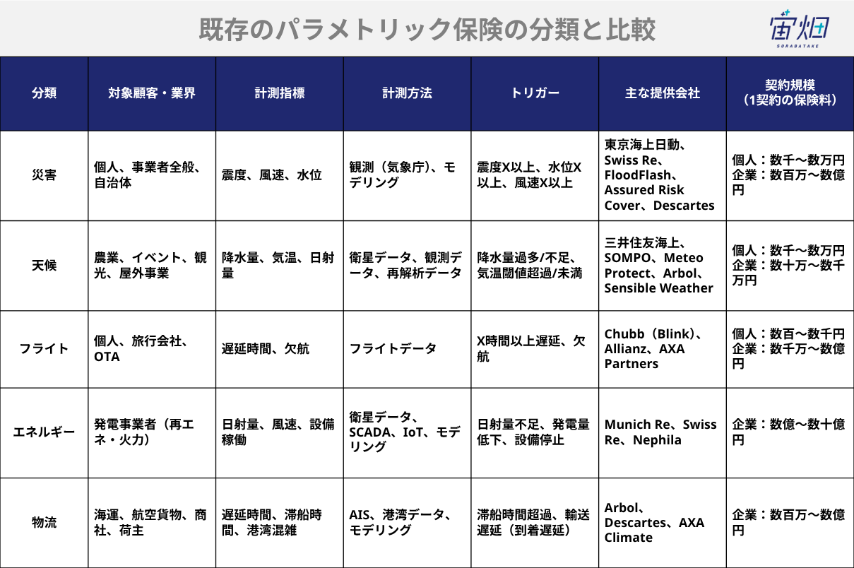 国内外で販売されているパラメトリック保険の主な事例を以下にまとめました。パラメトリック保険は、災害、天候、フライト、エネルギー、物流といった分野で商品化が進んでいます。
